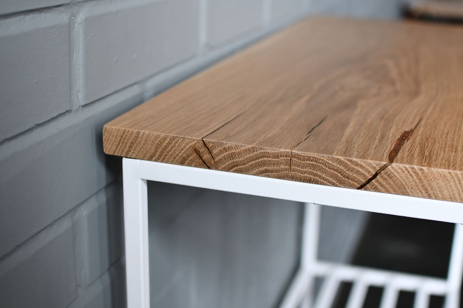 Верхняя полка из массива дуба с живым краем покрыта матовым бесцветным лаком, сохранен естественный цвет дерева.